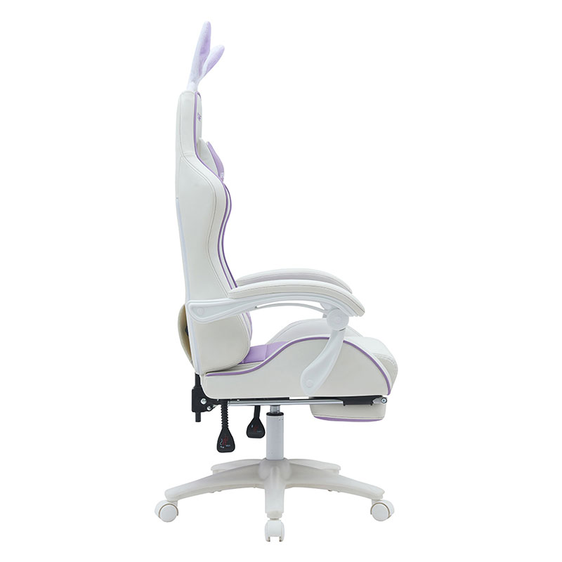 합성 가죽 360 회전 PVC PU 편안한 리클라이닝 귀여운 흰색 보라색 소녀 레이싱용 게임 의자 Silla Gamer(T-7114B)는 매끄럽고 세련된 흰색과 보라색 디자인이 특징으로 게임 설정에 재미 있고 유쾌한 느낌을 더해줍니다.